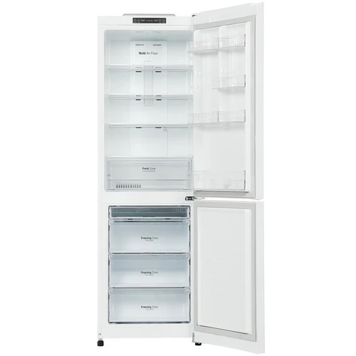 В холодильной камере имеются 4 стеклянных полки и выдвижной ящик для фруктов и овощей. Также предусмотрены пластиковые балкончики в дверце для размещения бутылок с напитками и пластиковых упаковок с продуктами. При перебоях с электричеством холодильник с морозильником LG GA-B419SWJL сохраняет холод до 16 ч.