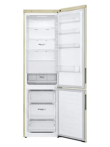 Панель холодного воздуха в верхней части холодильника обеспечивает на 32% более быстрое и равномерное охлаждение, чтобы ваши продукты сохранялись свежими еще дольше. Уровень шума в холодильниках LG DoorCooling+ 36 дБ, что на 25% ниже, чем в предыдущих моделях. Тихая и надежная работа, чтобы ничего не нарушало вашего спокойствия дома. Усовершенствованная складная полка теперь имеет два этапа сложения, что позволяет хранить крупные и габаритные продукты или блюда. С нулевым зазором холодильник LG можно ставить вплотную к стене и открывать дверь на 90°. Благодаря этому ящики выдвигаются беспрепятственно. Система многопоточного охлаждения (Multi Air Flow) равномерно распределяет холодный воздух для того, чтобы продукты оставались свежими дольше даже на верхних полках холодильника.