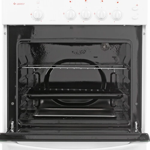 Газовая плита GEFEST 1200 C6 также оснащена вместительным духовым шкафом, объем которого составляет 63 литра. Этого вполне достаточно для того, чтобы одновременно готовить несколько различных блюд. Работает духовка только лишь в одном режиме – статический нагрев. Внутри установлена лампа накаливания, выступающая в роли подсветки. Дверца, закрывающая шкаф, оснащена жаропрочным стеклом, сквозь которое можно следить за степенью готовности продукта. Габариты устройства составляют 60х60х85 сантиметров.